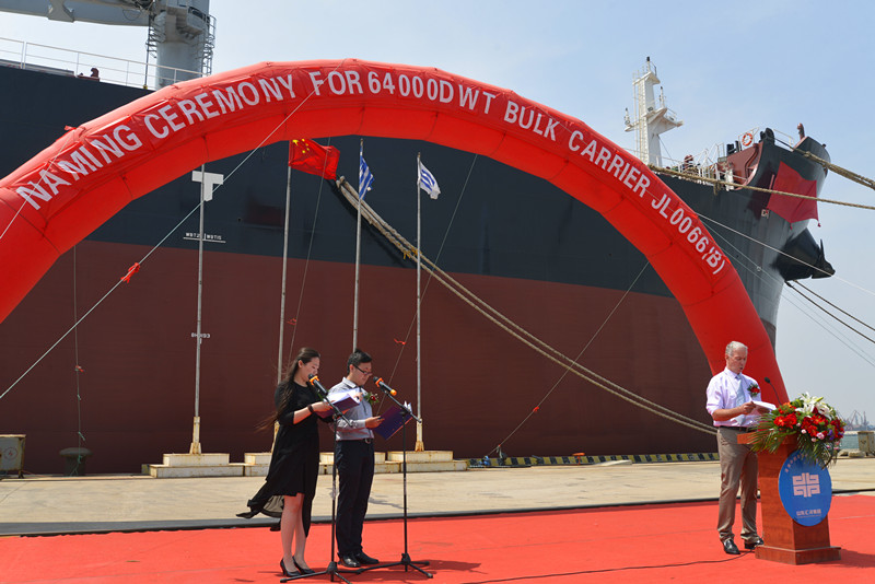 2016年6月10日上午10:30,JL0066(B)船命名儀式在京魯船業(yè)舾裝碼頭圓滿舉行。JL0066(B)船教母Margarita Sigala女士、拉維尼亞集團(tuán)新造船項目經(jīng)理康斯坦汀尼迪斯·尼古拉斯先生、安全管理經(jīng)理彼得羅斯·斯塔米先生、駐廠經(jīng)理亞尼斯·瓦加斯先生、JL0066(B)船長和輪機長、蓬萊中柏京魯船業(yè)有限公司總經(jīng)理樸燦先生、常務(wù)副總經(jīng)理于以龍先生及京魯船業(yè)各位副總經(jīng)理等參加了此次命名儀式。